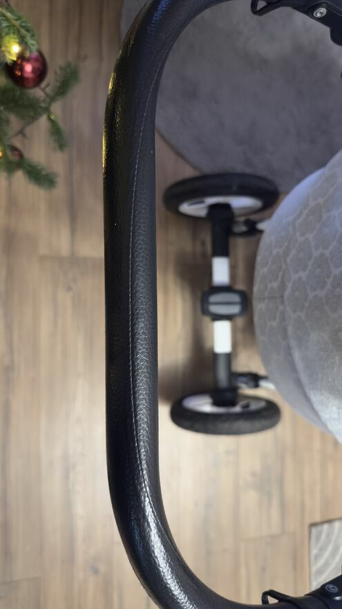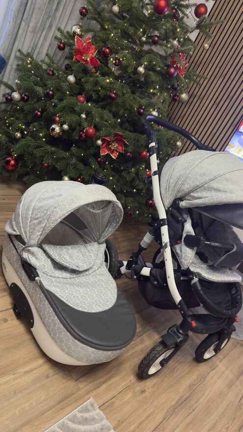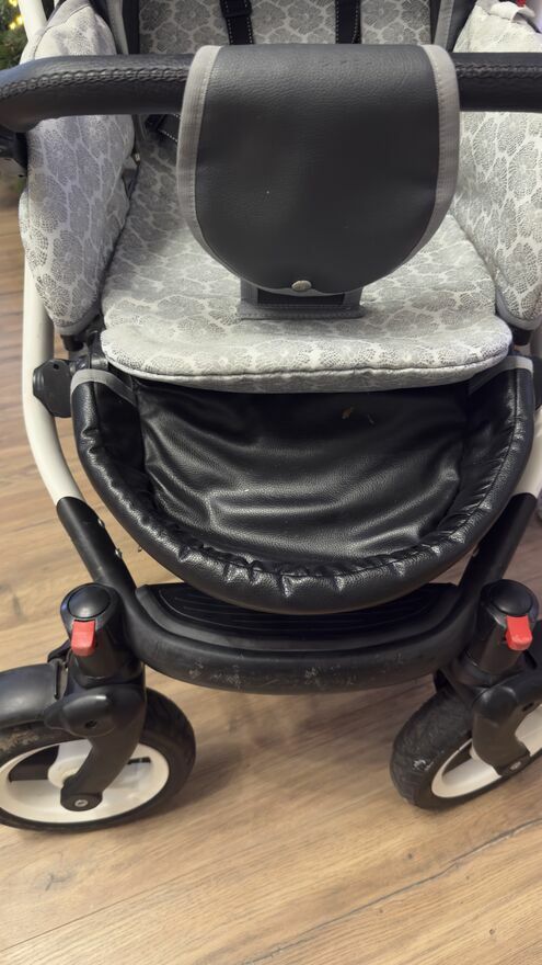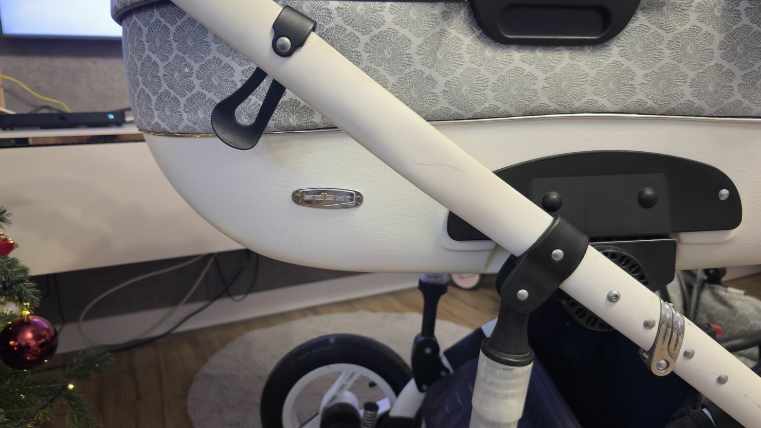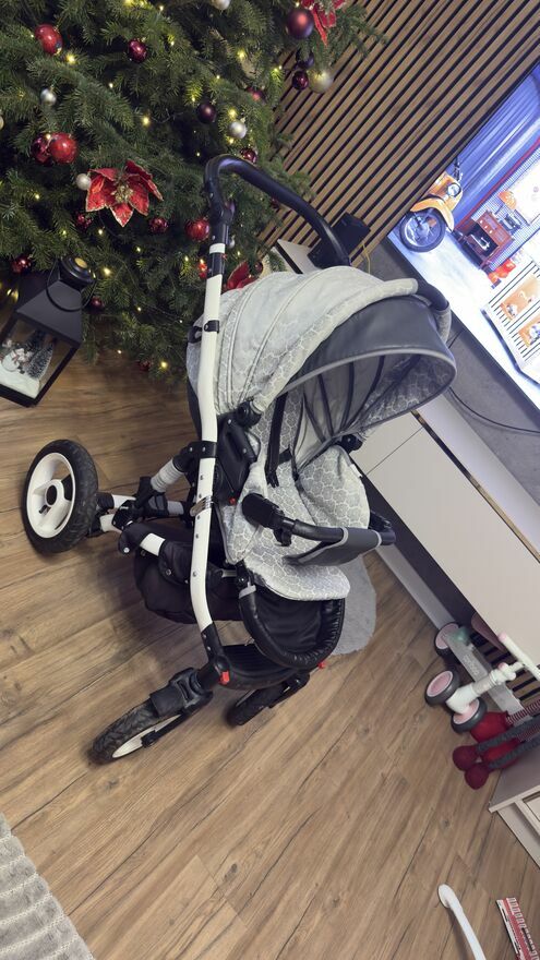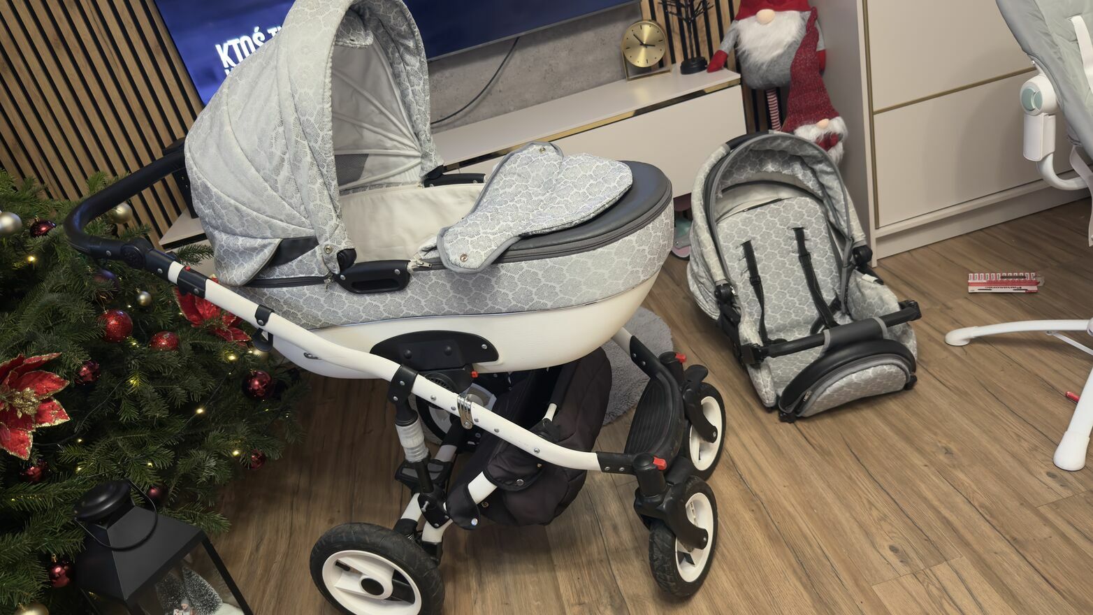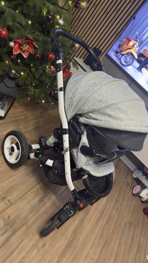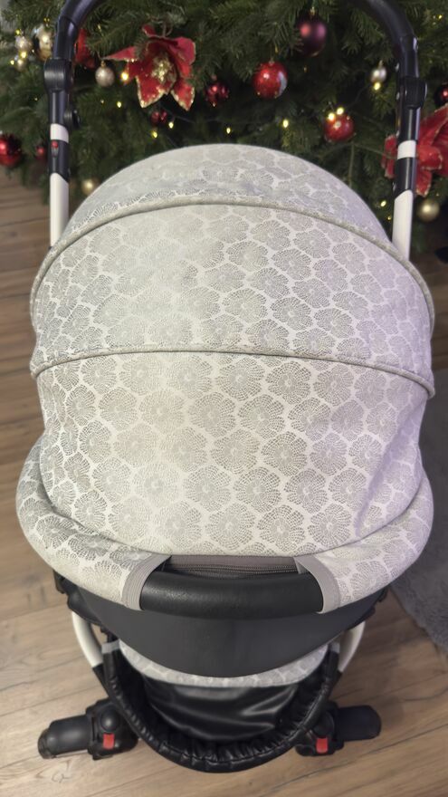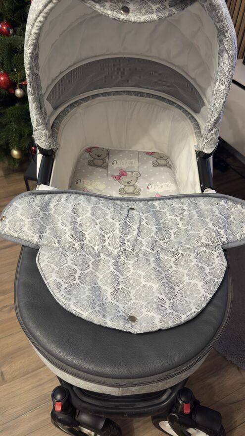 Posiada własne zadaszenie, przykrycie na nóżki, szelki pięciopunktowe, barierkę zabezpieczającą.